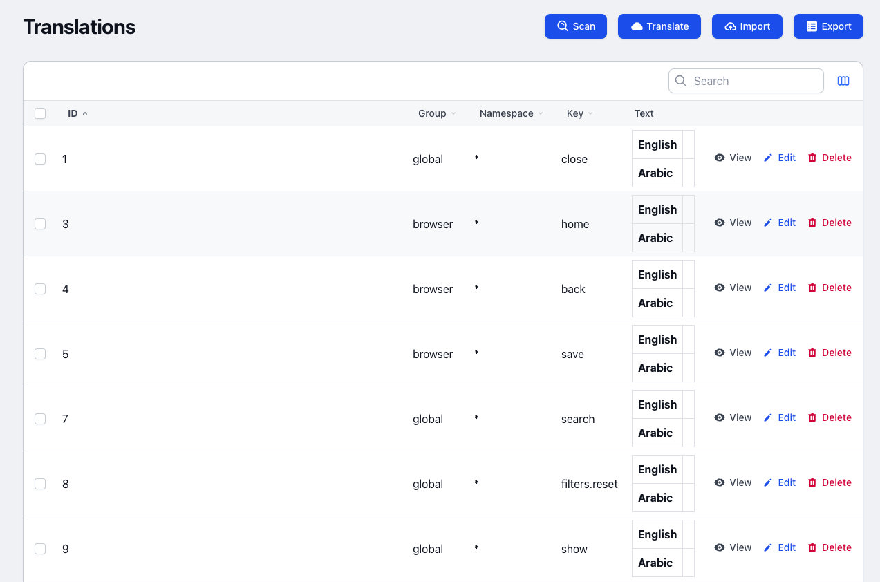 we build a translations loader that loads translations from the database, and you can scan current translations and export them to an excel sheet and import it again to the system.